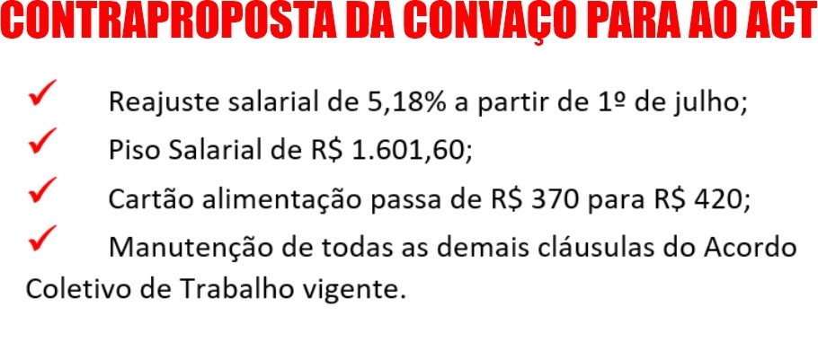 Reproduzimos abaixo a contraproposta patronal para deliberação em assembleia e reiteramos a importância da presença de todos para tomarmos uma decisão consciente através do voto secreto de cada trabalhador.