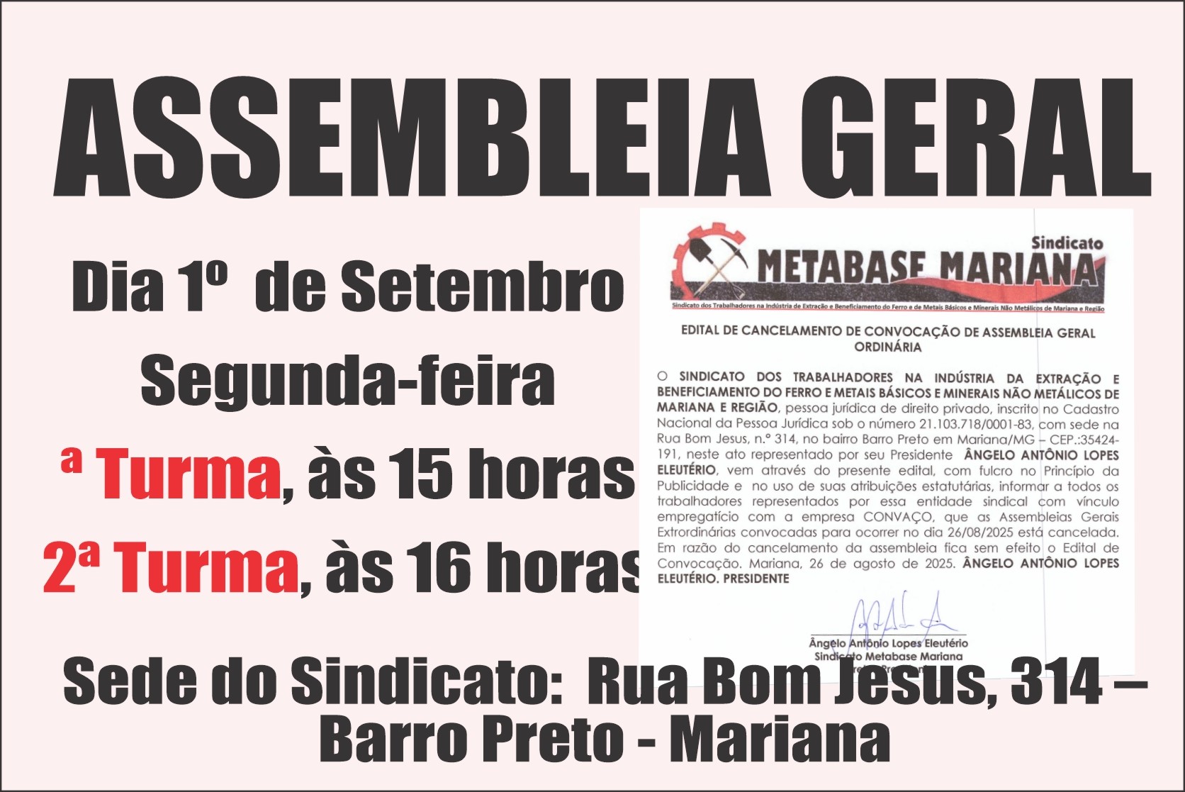Em razão de imprevisto, o METABASE MARIANA precisou mudar a data da Assembleia Geral em que os trabalhadores na Convaço deliberarão sobre a contraproposta da empresa para o Acordo Coletivo de Trabalho 2025/2026.